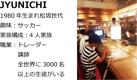 親元を離れ、サッカー命の学生生活をしていたんですが、高校卒業と同時に自分の実力と向き合い、サッカーを諦め状況・就職をしました。 初めての大金。 高卒なのでまだ18歳。 いっきにはっちゃけまして、競馬にパチンコ マージャンとハマって気付けば500万を越す借金地獄に。。。 これではダメだと思って、地元に戻って大きな企業を面接。 バイトで入りましたが元々のストイックな性格と、ハマりやすいのもあって順調に正社員へ。 ですが頑張ればがんばるほどストレスが溜まって、競馬・パチンコからの呪縛からは逃れきれず、、、 そんな時、幼馴染が起業し年間何億も稼いでいると聞いて、雇ってもらおうと思い仕事をやめました。 幼馴染が僕に与えた仕事が「会社の資金管理」というパット見、僕に一番似合わない仕事だと思ったんですが、ここでであったFXで才能を開花させました。 ここから5年。 FXのスクール運営を始めて3年で生徒は3000名を超えました。 そしてスクール運営と一緒に始めたバイナリーオプションで新たなキャッシュポイントも作れるようになり、気付けばバイナリーオプションでも「先生」と呼ばれる立場となりました^^ バイナリーはより現実が見えている、 確実な資金管理方法だと思います。 JYUNICHI |